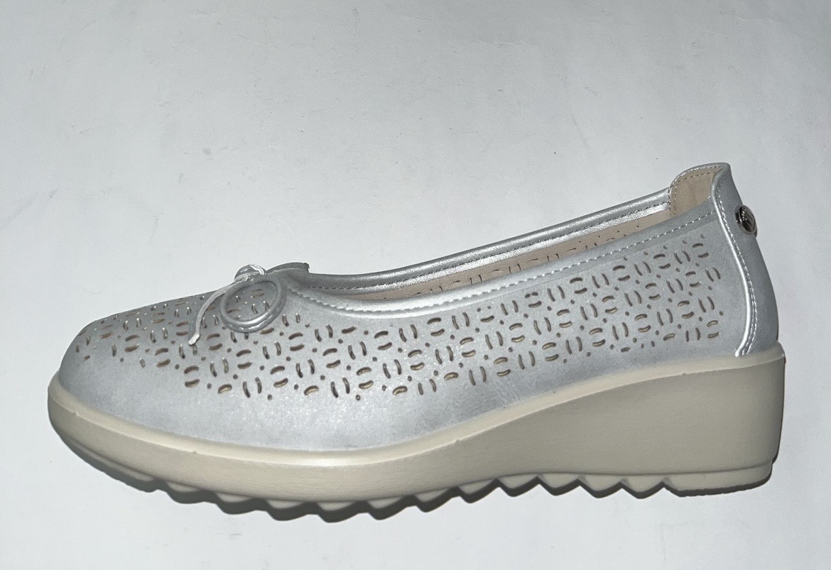 Zapato bailarina de mujer, estilo casual. Modelo cómodo, fabricado en piel sintética suave y picada. Suela de goma ligera y flexible. Plantilla acolchada y extraíble. Color platino. Sabrina versátil y elegante que dará el máximo confort en tu día a día.