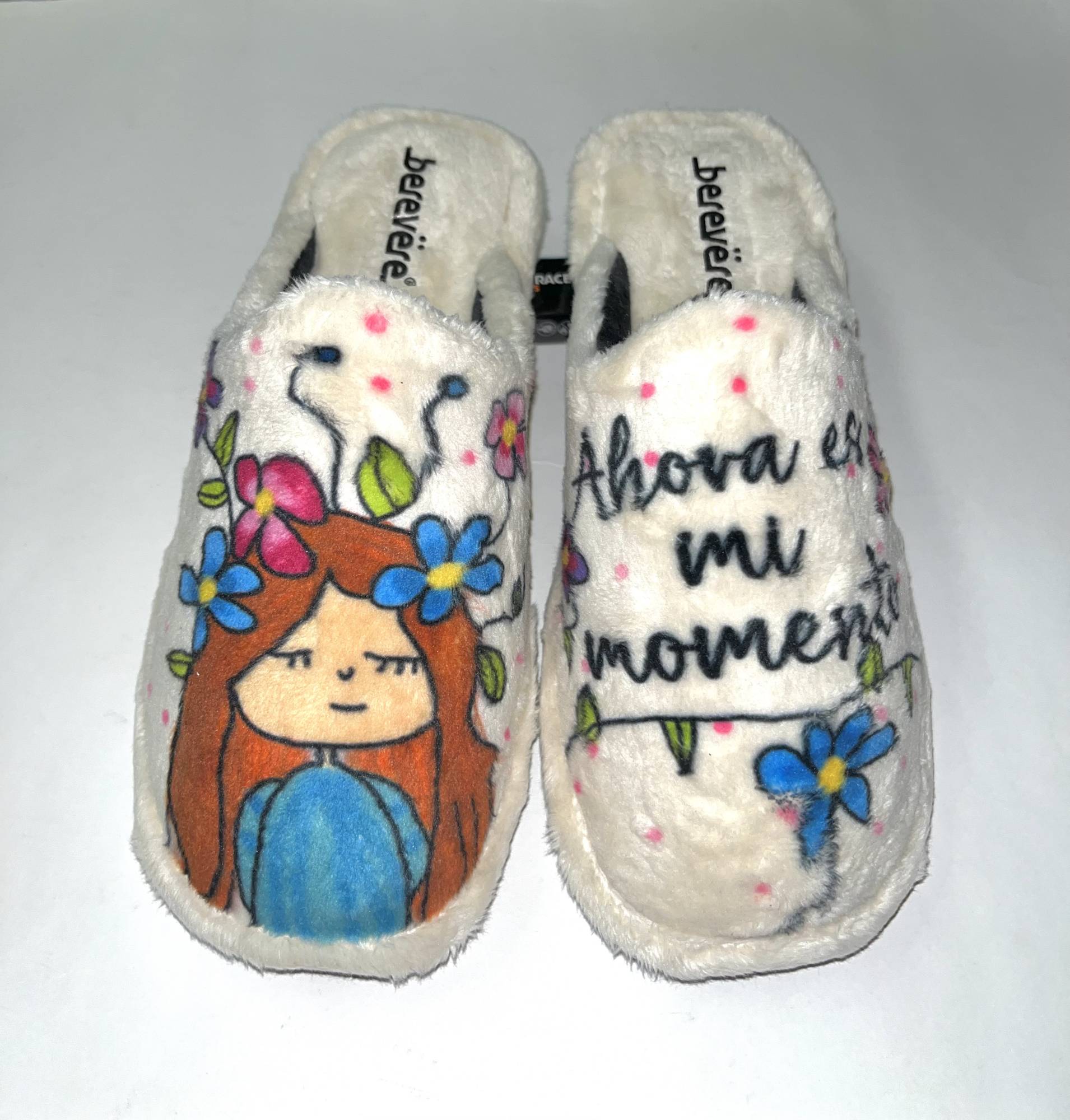Chinela de la casa Berevere, fabricada en España con materiales de buena calidad. Toda de pelo corto suave y agradable al tacto. De color gris suave con un precioso dibujo en colores y un bonito mensaje.